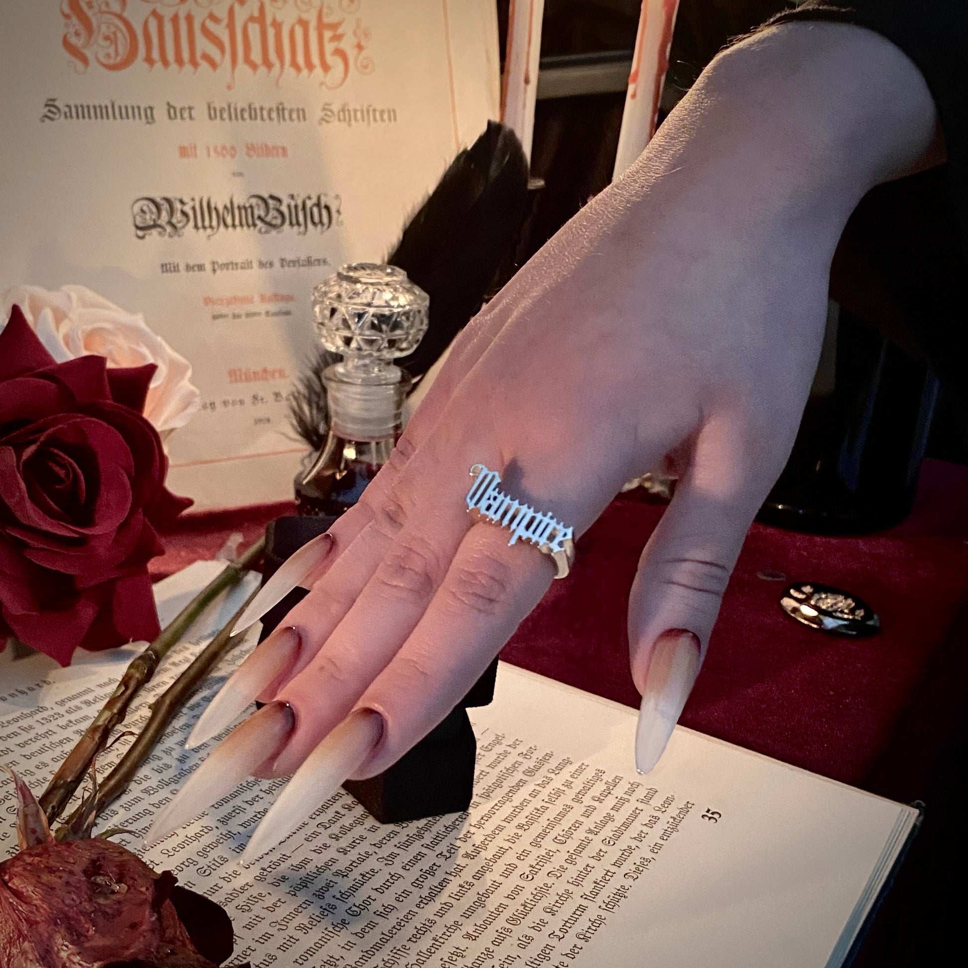 Anillo confeccionado en plata ley 950, perfecto para lucir tu lado más vampiro. Con un diseño elegante y tipografía Fancy Card Text este anillo te hará sentir como una verdadera criatura de la noche. Hecho con plata sólida, materiales de alta calidad y tecnología 3D, lo que garantiza un anillo duradero y resistente. Además, es anti-alergénico, lo que lo hace ideal para pieles sensibles.