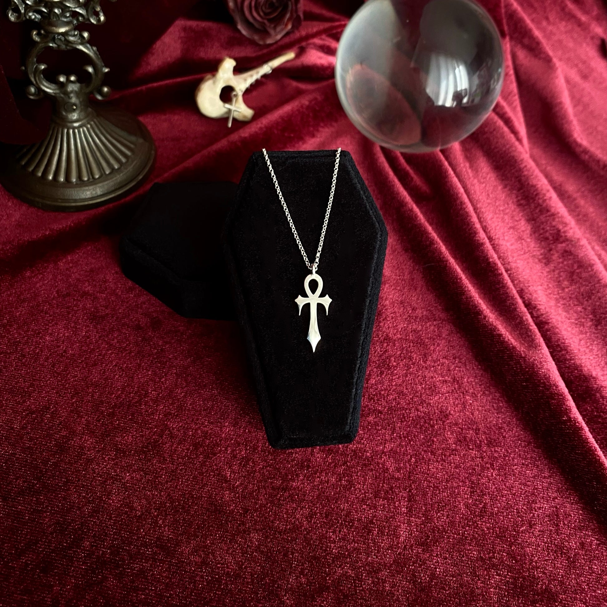 Este diseño combina la simbología de la cruz egipcia (Ankh) con la cruz gótica. Este accesorio evoca la esencia de la eternidad y la vida después de la muerte, y es confeccionado en plata 980 para ofrecer un símbolo de protección y espiritualidad.