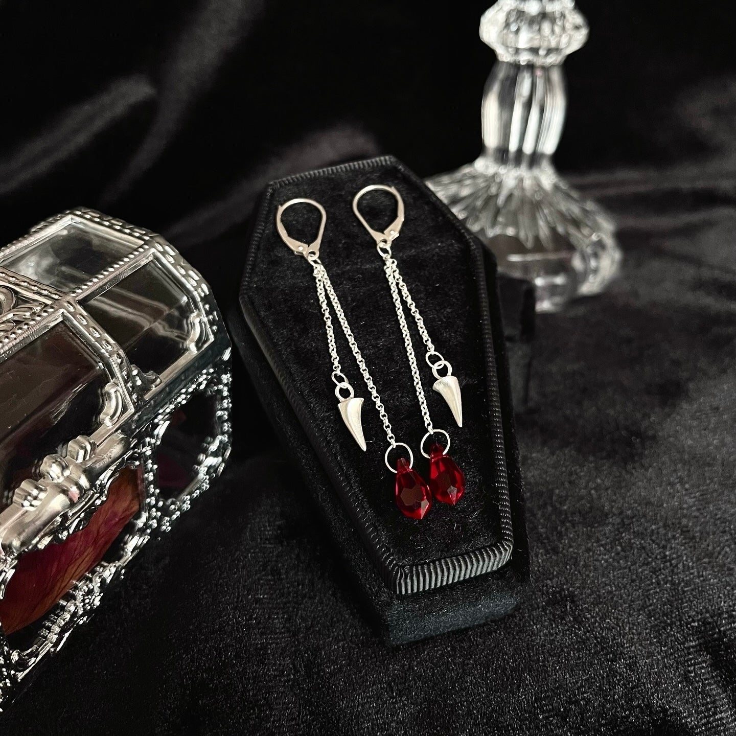 Pendientes elaborados en Plata 950 con terminal de cristales sangrientos y colmillo. Perfectos para darle un toque vampiresco y sangriento a tu outfit 😻🌹.