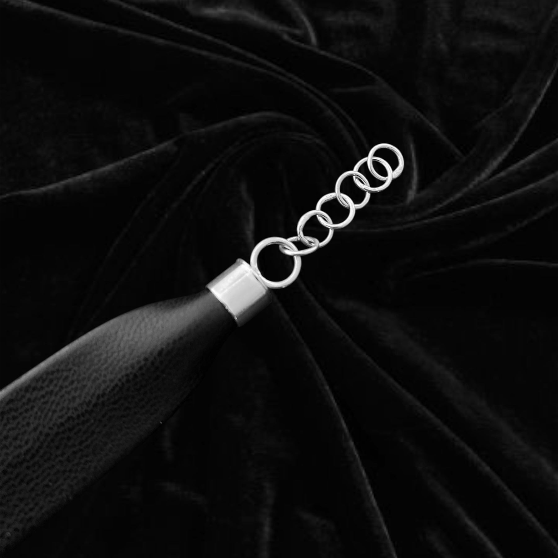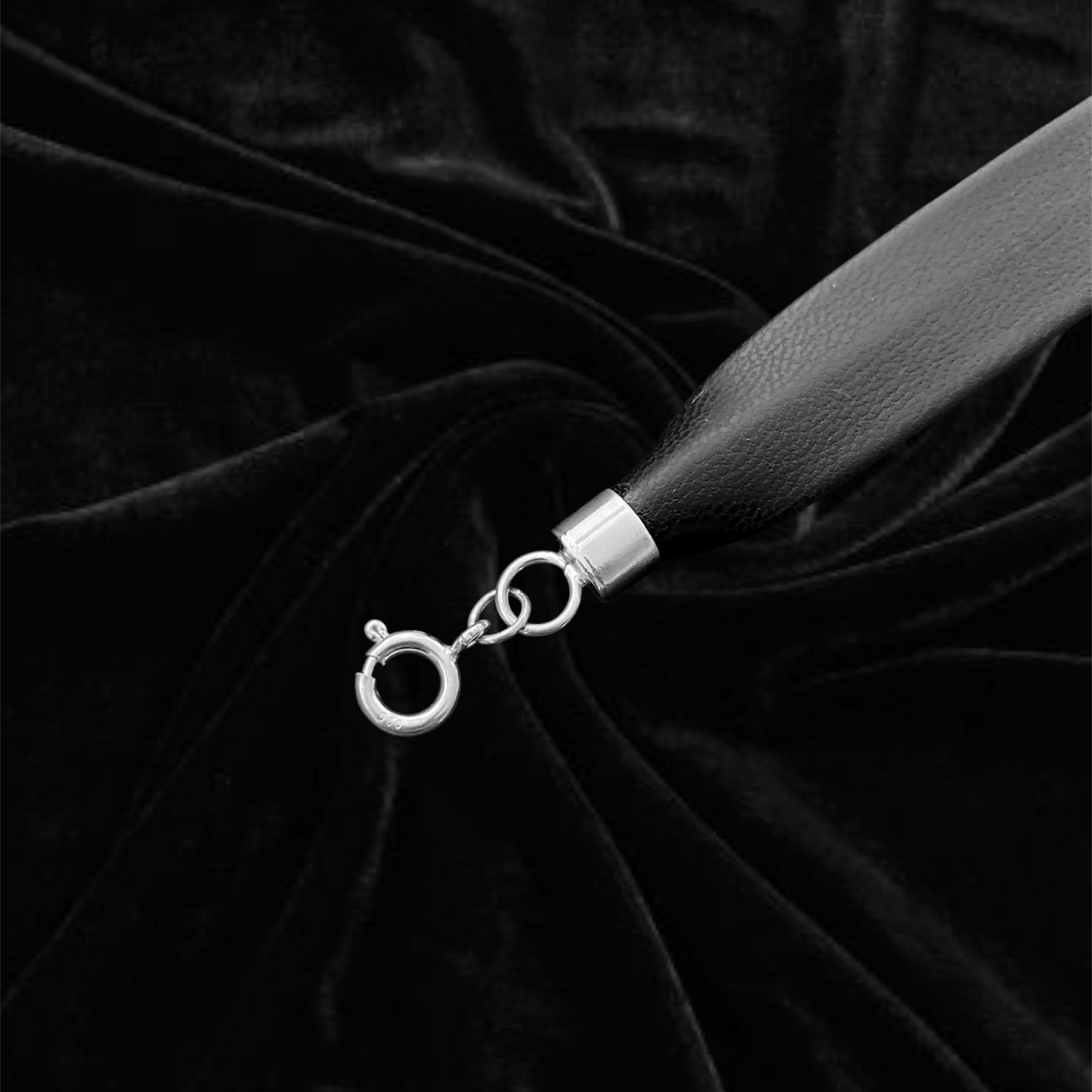 Gargantilla de plata 950 confeccionada en cinta eco cuero suavecita y ajustable a la medida de cada cuello. Cuenta con terminales de plata y extensión de 3 cm de cadena ⛓️💥.