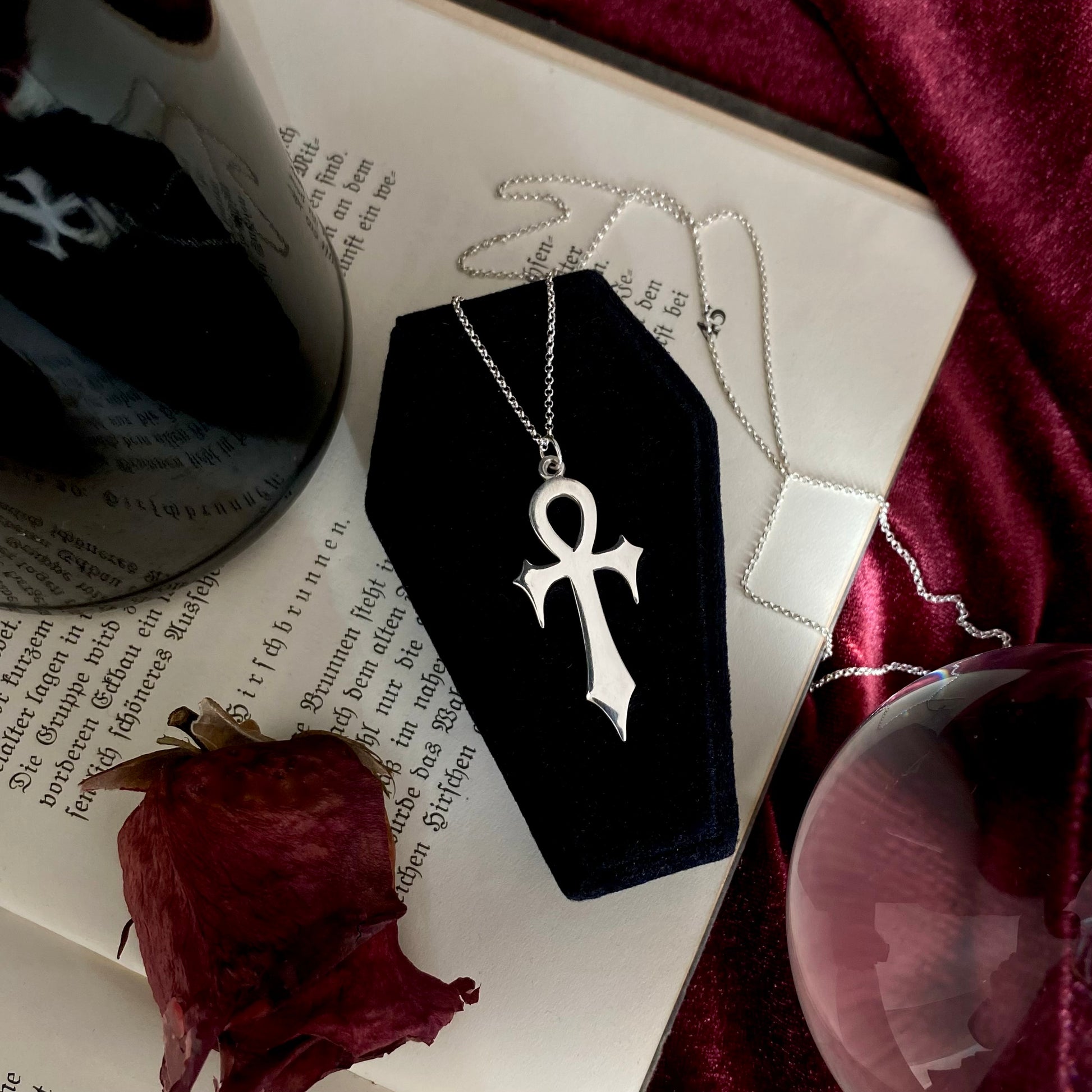 Este diseño combina la simbología de la cruz egipcia (Ankh) con la cruz gótica. Este accesorio evoca la esencia de la eternidad y la vida después de la muerte, y es confeccionado en plata 980 para ofrecer un símbolo de protección y espiritualidad.