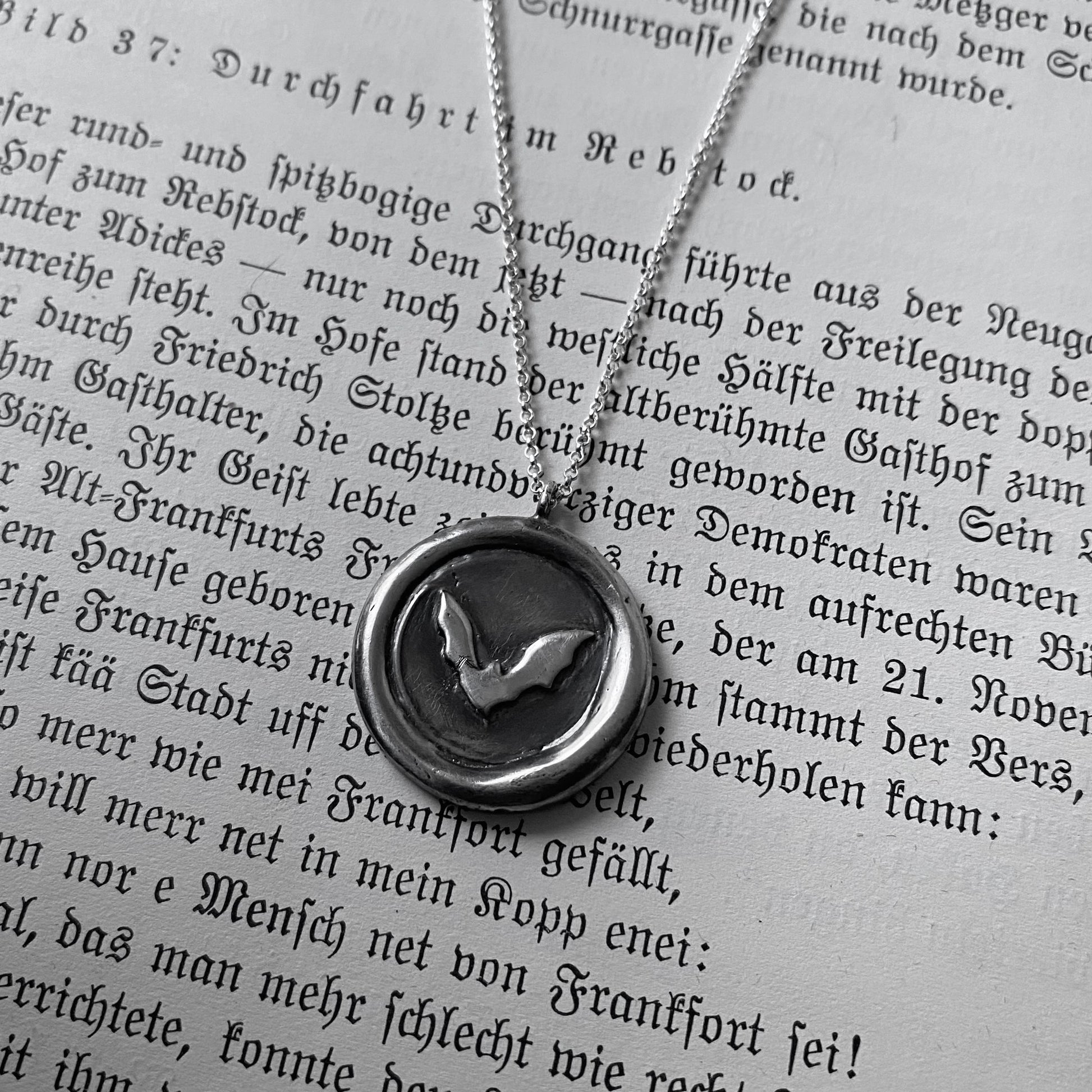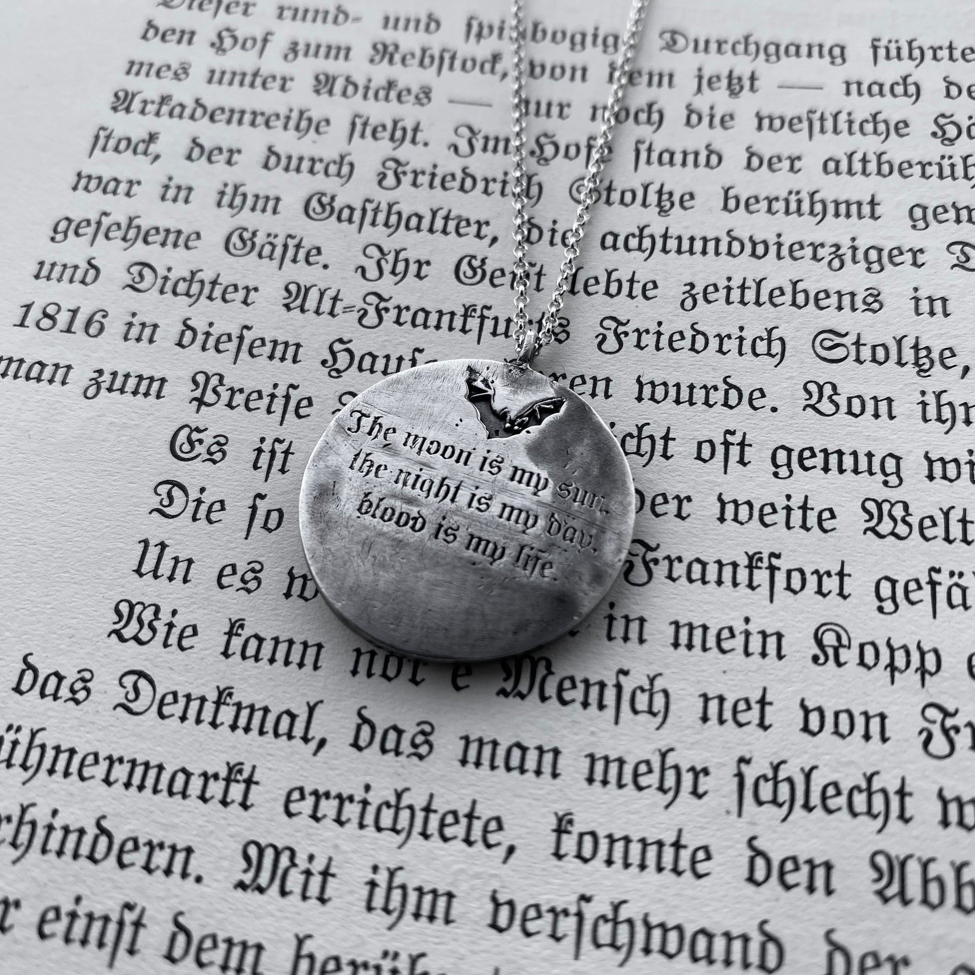 Medalla efecto lacre confeccionada en Plata 950. Es un accesorio perfecto para llevar a diario y como amuleto. Consta de un murciélago en su frontis y una frase con tipografía Fraktur que evoca la esencia vampírica y el romanticismo de la noche.