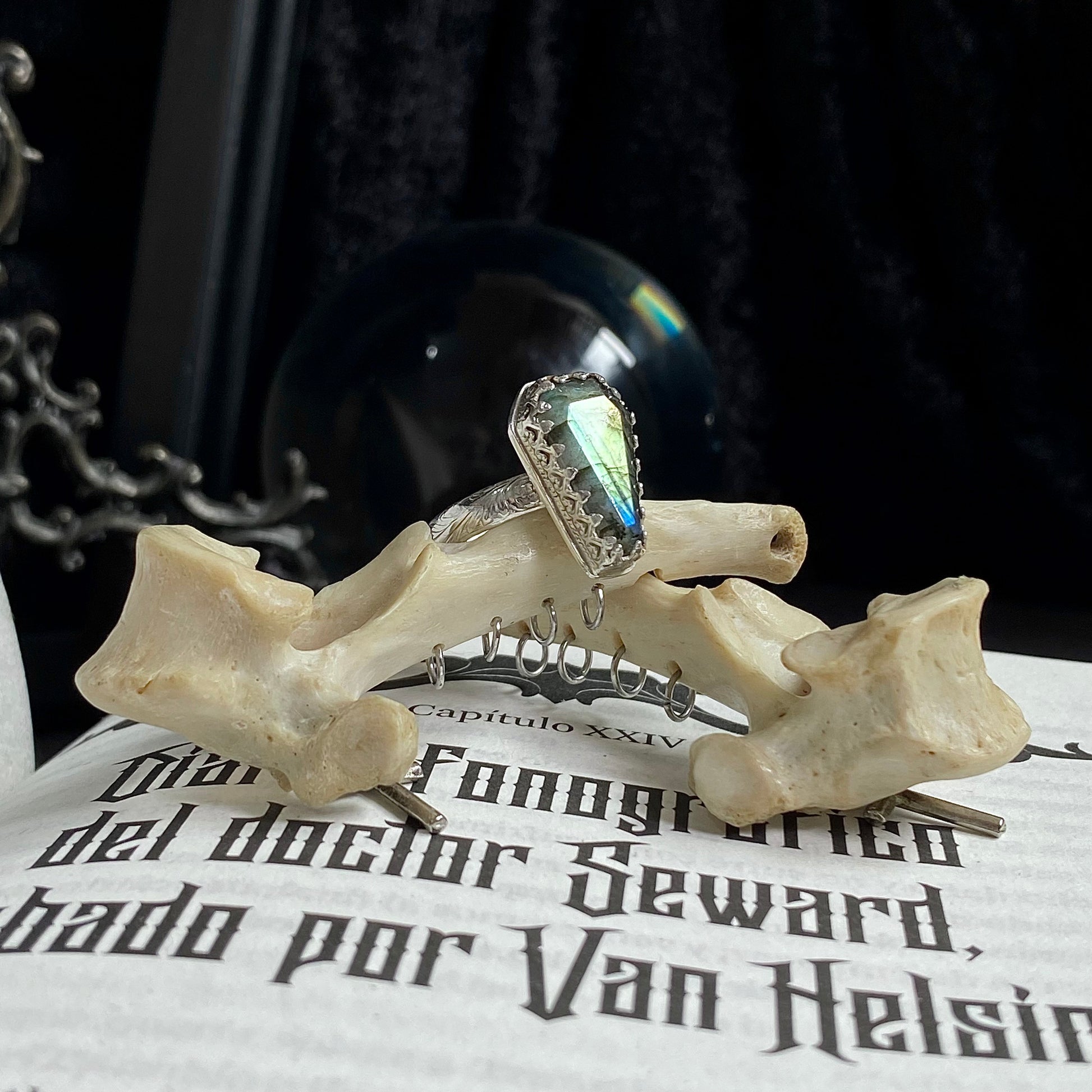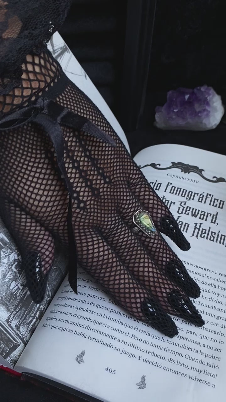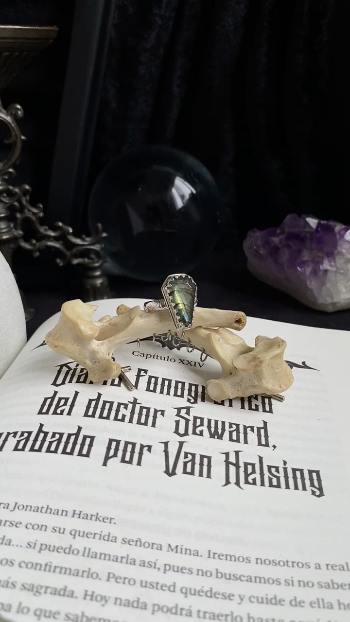 Anillo confeccionado en plata 950, adornado con un ataúd de piedra labradorita y tiene una talla 12 europea. ¡Está disponible para entrega inmediata!
