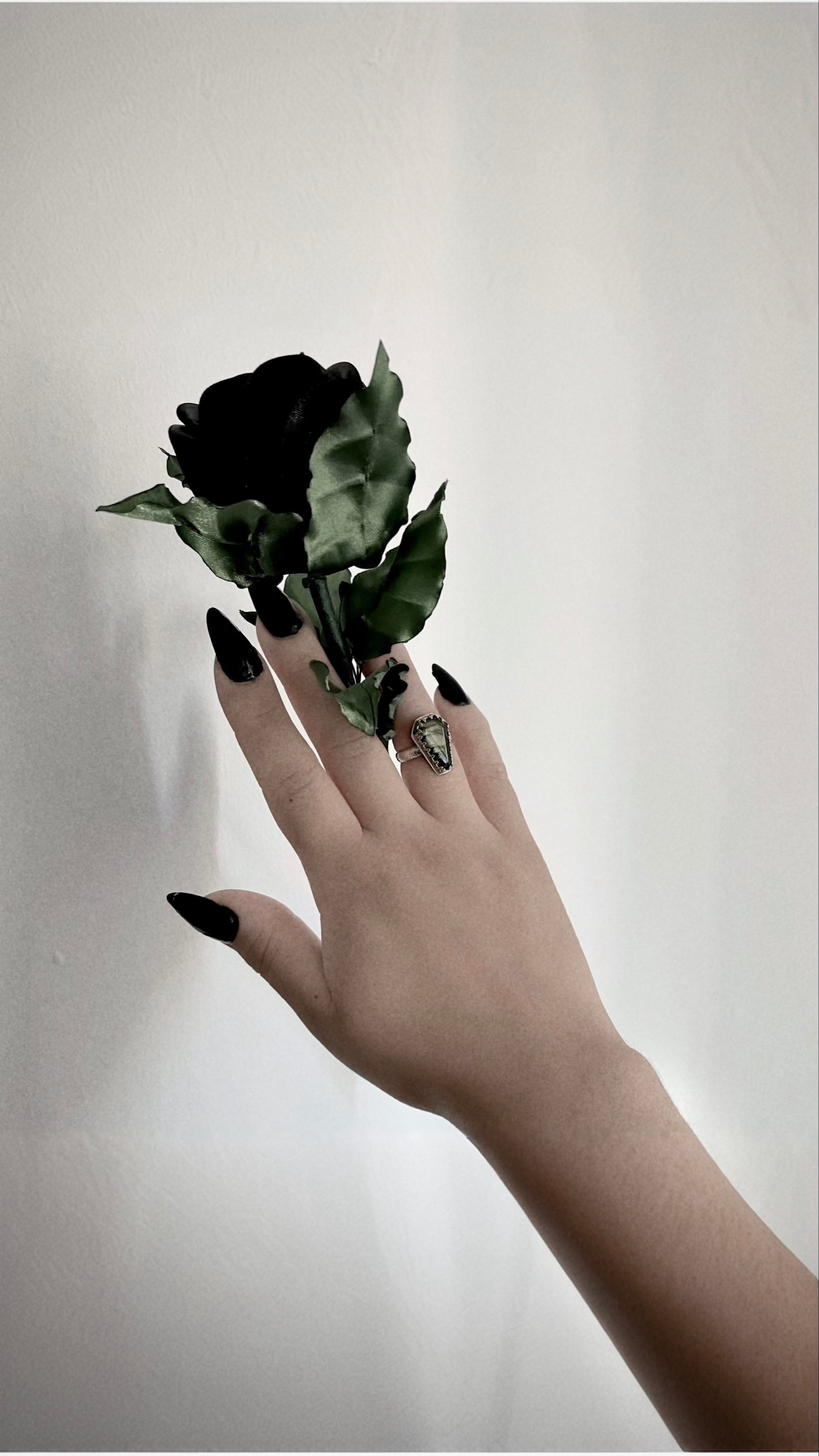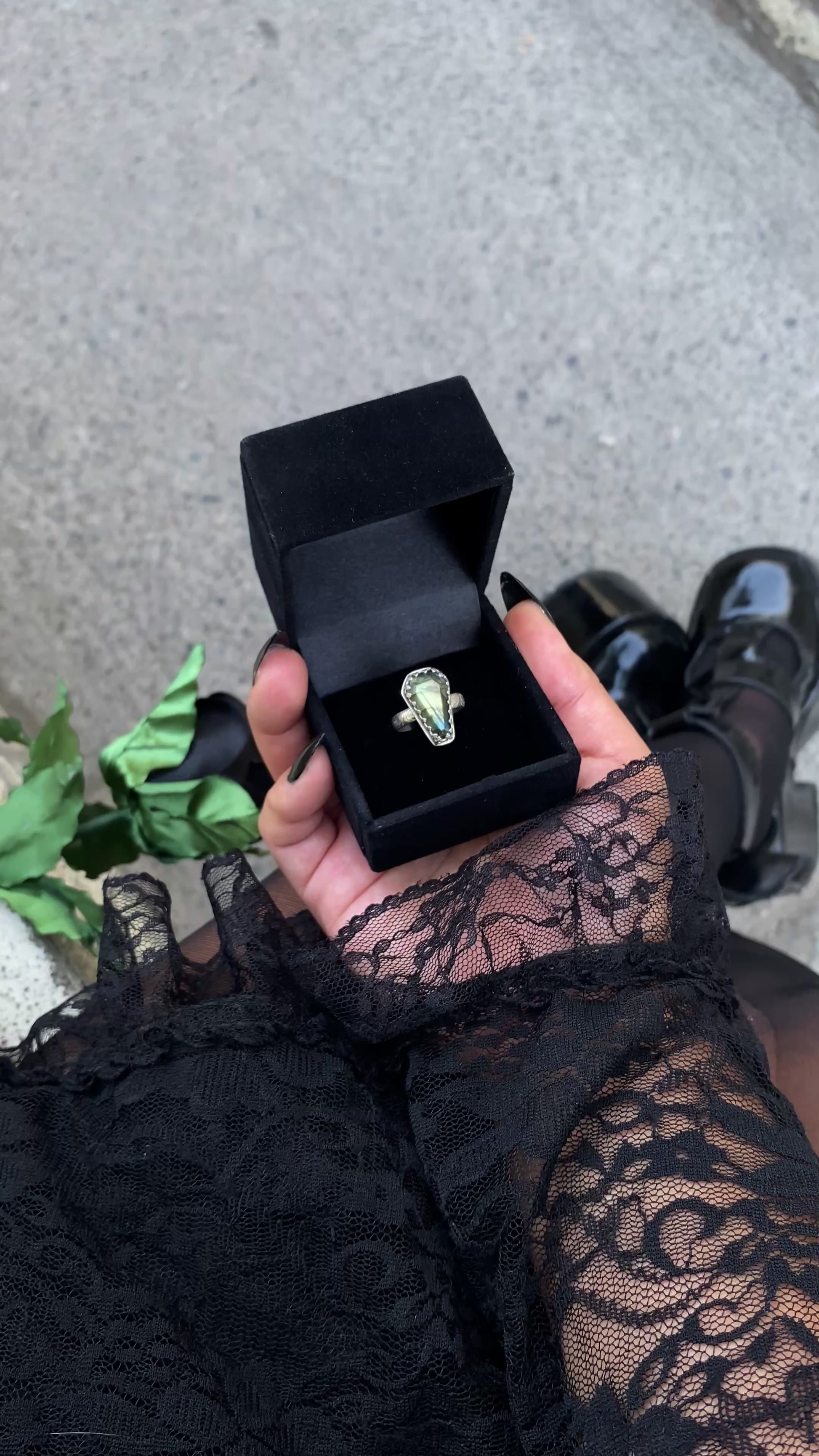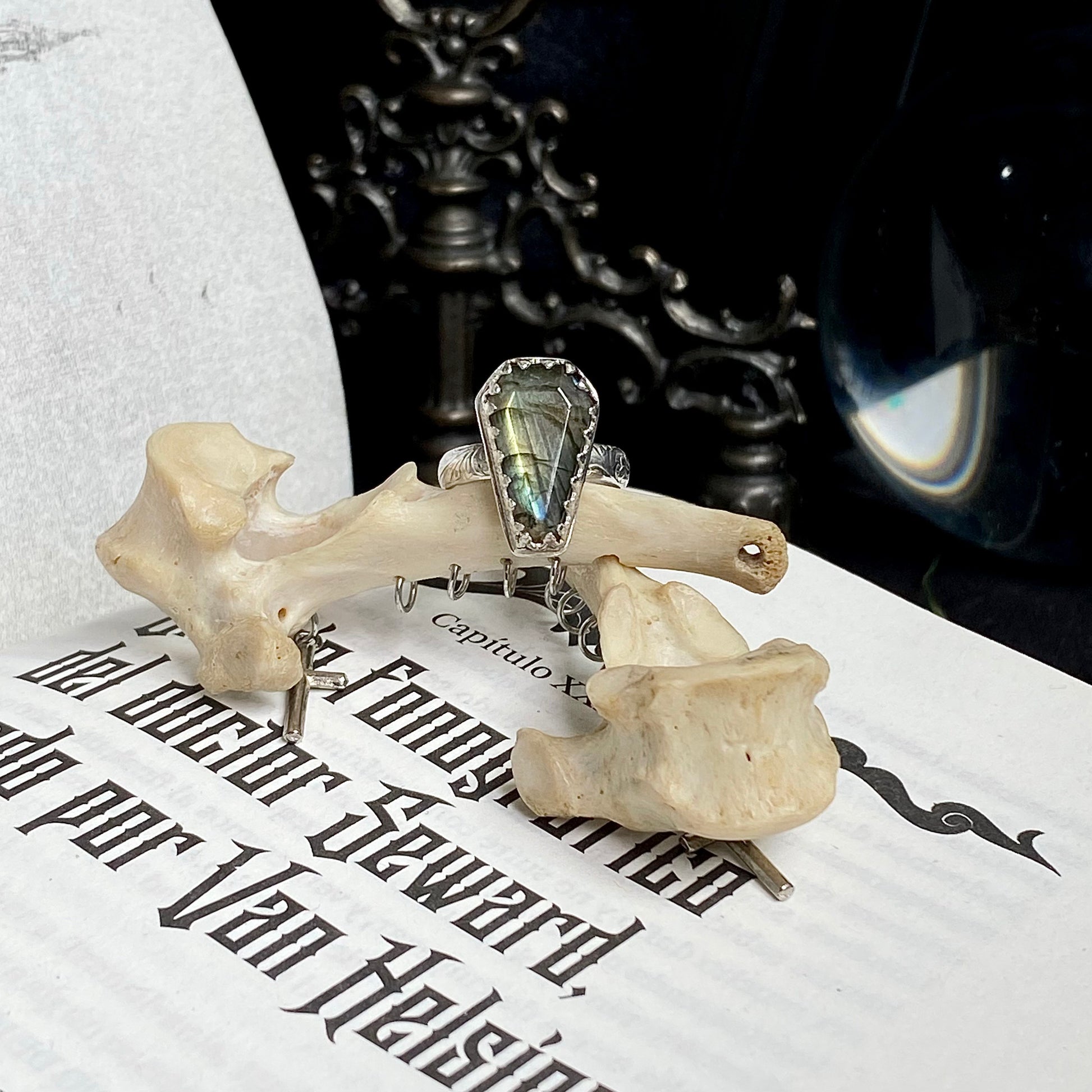 Anillo confeccionado en plata 950, adornado con un ataúd de piedra labradorita y tiene una talla 12 europea. ¡Está disponible para entrega inmediata!